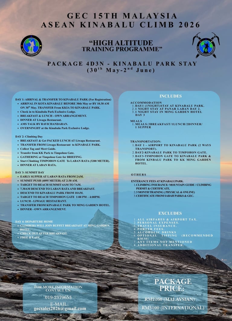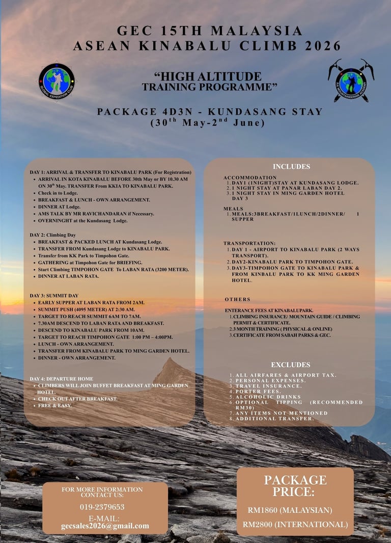 The Kinabalu Malaysia - ASEAN Climb is Global Expedition Club's (GEC) flagship annual programme, uniting adventures, hikers, and ASEAN delegates for an unforgettable journey to the summit of Mount Kinabalu - Malaysia's highest peak and a UNESCO World Heritage Site.